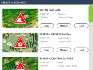 ”Stop Disasters!” aims to inform individuals of disaster impact and prevention, using challenge and narrative as its primary types of fun. At the start of the game, players are introduced to the target area, which players chose at the beginning of the game (options include: Southeast Asia, Eastern Mediterranean, and more). The player is then warned of an incoming natural disaster and provided useful information about the target area (terrain, population count, etc.). A challenge is then given to the player: to save as many people as possible, through different measures that reduce the impact of the disaster.