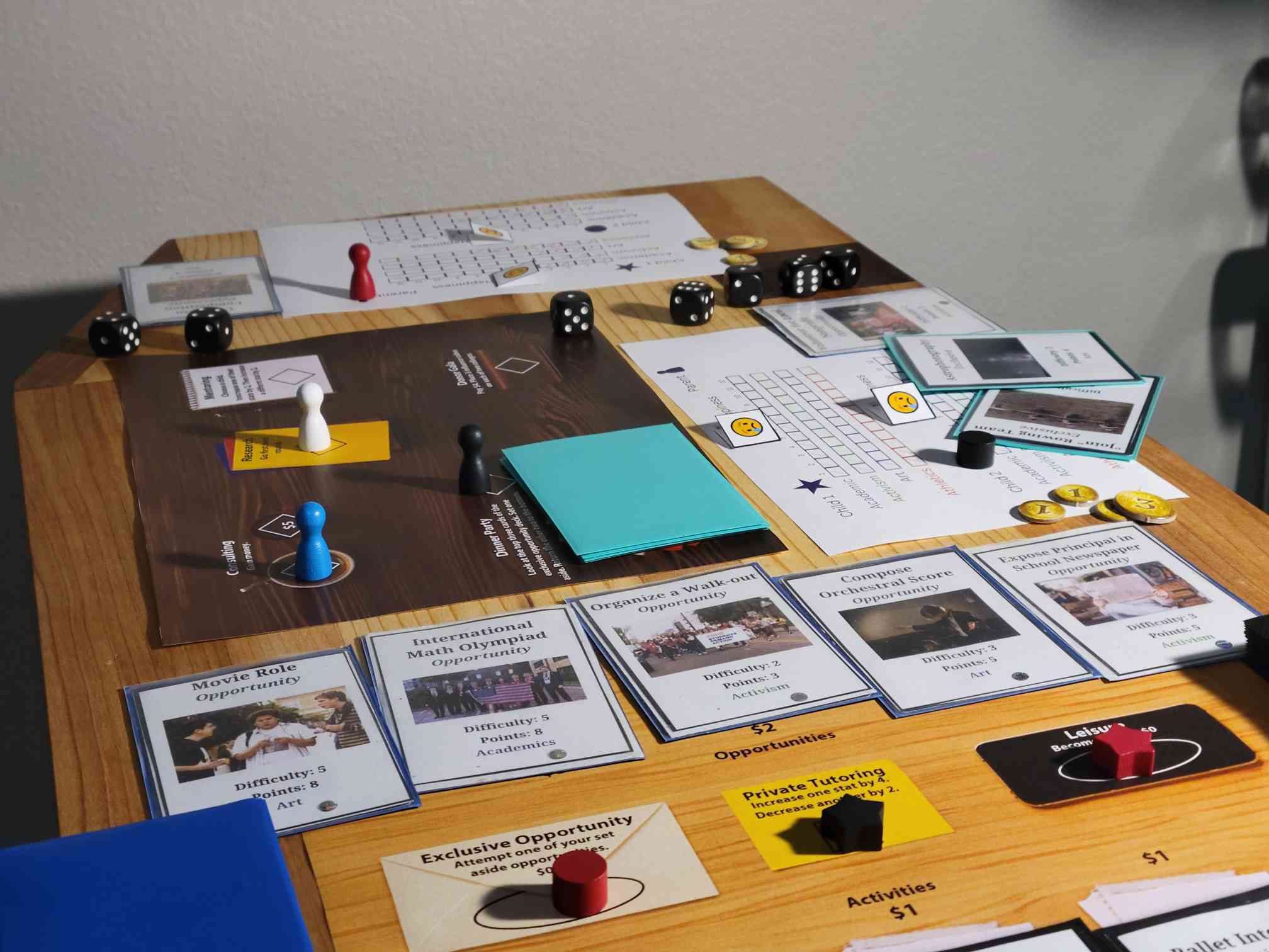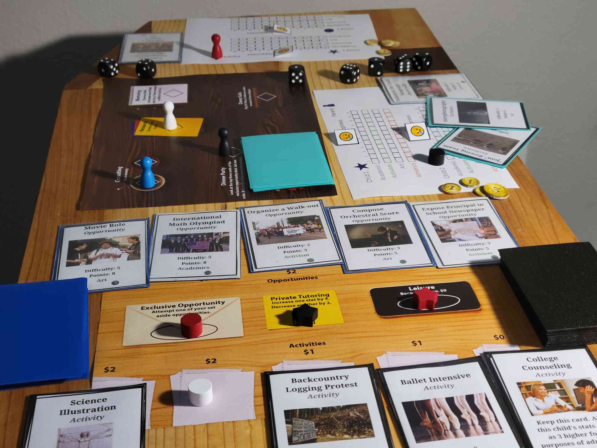 Helicopter Parent began as all bark and no bite: repetitive gameplay and tacit criticism without depth. By the end, Helicopter Parent had evolved into a strategic, dramatic game. The constant cycling of Opportunity and Activity cards gives players new options to consider in every round, whereas the dice-rolls to claim Opportunities create strong emotional highs and lows. Throughout, the game’s theming provides a sharp critique paired with opportunities for players to laugh at the absurdities of helicopter parenting and elite college admissions.