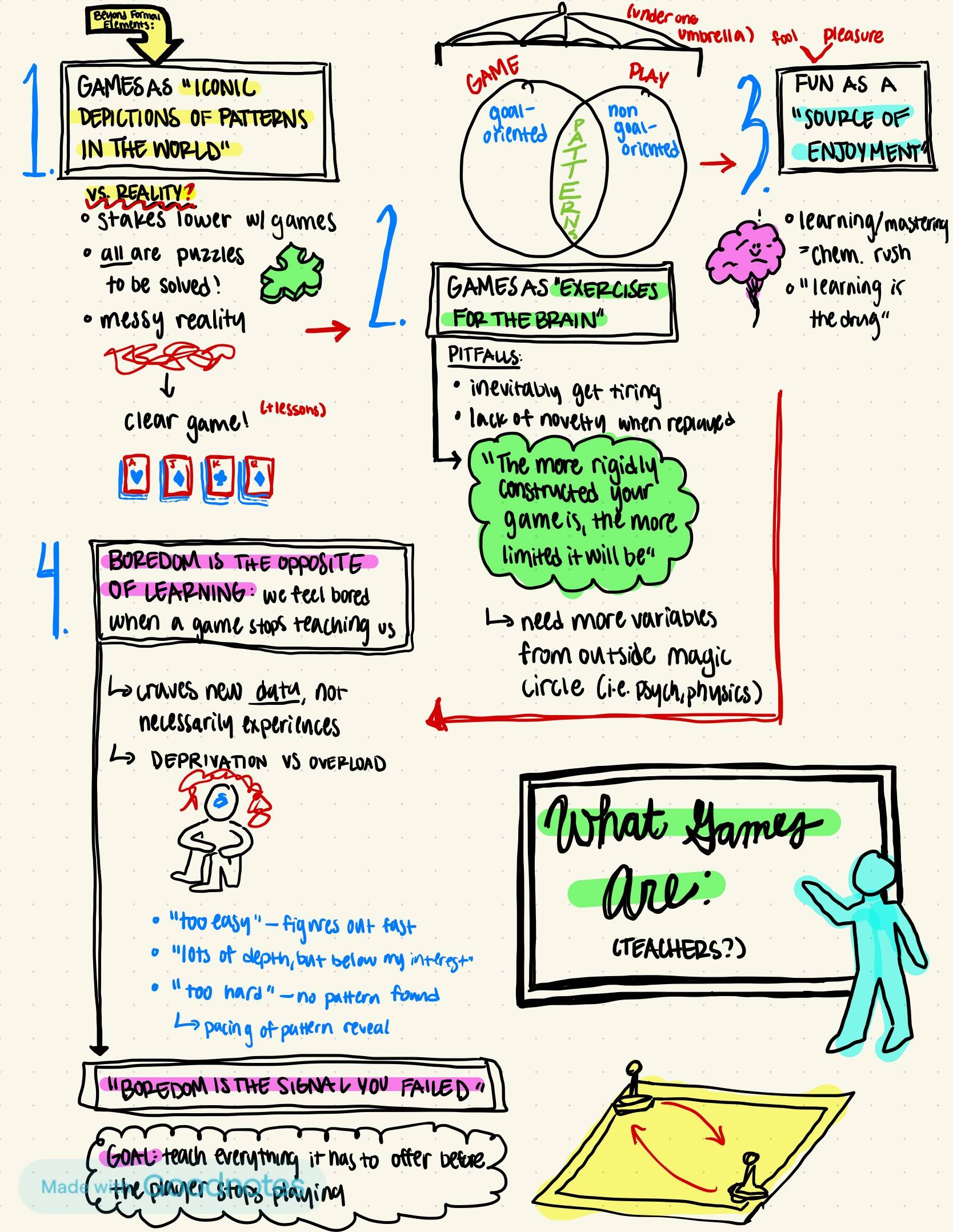 Here’s my sketchnote on what games are and aren’t! This gave me a lot to think about in regards to what fun is and the different forms that story can take, especially as someone who’s also written across different mediums (songs, narrative, screenwriting).