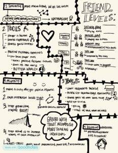 Here are my sketch notes for “Game Design Patterns for Building Friendships”! I tried to do the black and white challenge….made hierarchy much more difficult!