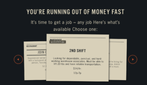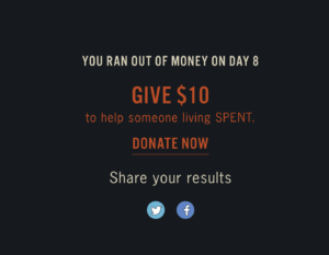 Outcomes: inside the game, the outcome is to last the full month. I think the game gets very exciting because there’s so many different actions you can take to reach the goal outcome. However, beyond gameplay, the game ends with a call to action to donate or volunteer to help out real people who are actually living through this struggle. This game left a very strong emotional impression on me, as it’s something a lot of us (especially as students) take for granted. In the image below, the call to action takes me to a website that has a lot of information on poverty and how even a $10 donation can go a really long way.