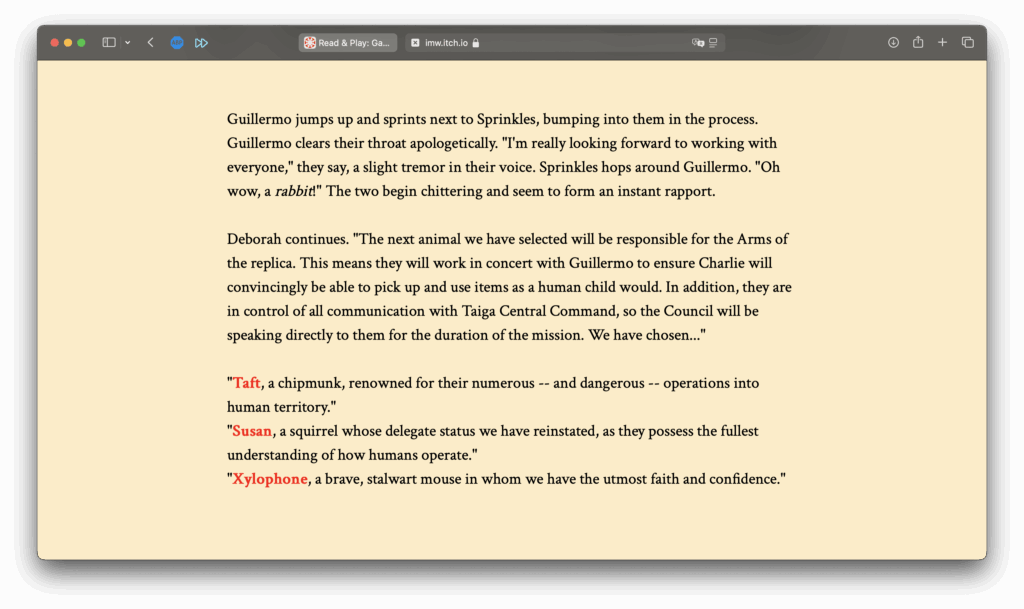 This week I played Animalia, a work of Interactive Fiction (IF) designed, written, and published by Ian Michael Waddell for free on itch.io. In this game, you play as a group of four animals from the Taiga who are in charge of pretending to be a nine-year-old child in order to save their home from human invasion. Although not explicitly stated, Animalia seems targeted towards people already familiar with IF and platforms such as itch.io that typically host indie games and other IFs. A Google search for “Animalia” doesn’t return anything regarding video games, and “Animalia game” returns other video games that have the same name. Only when you explicitly add “interactive fiction” to the search will its itch.io link appear.