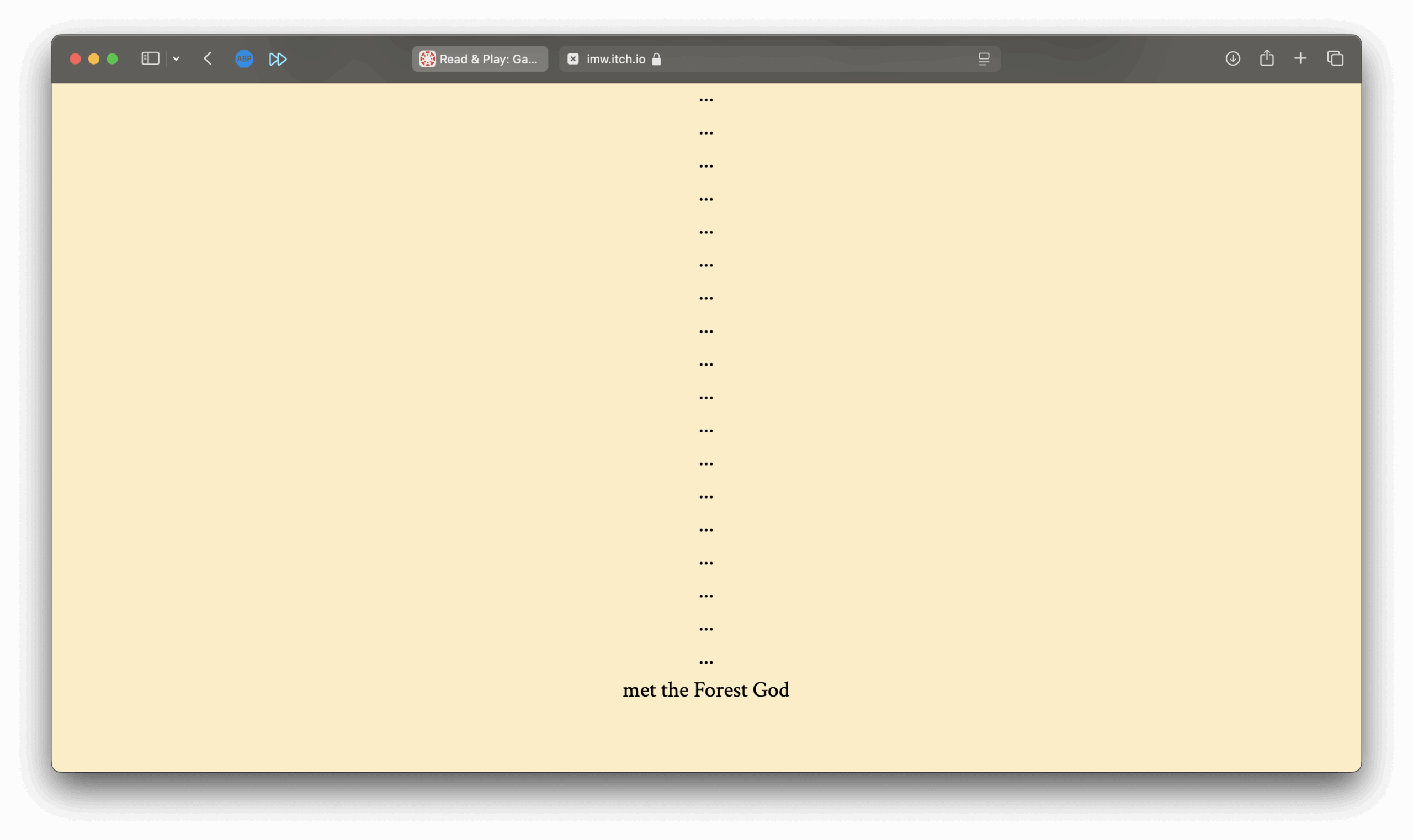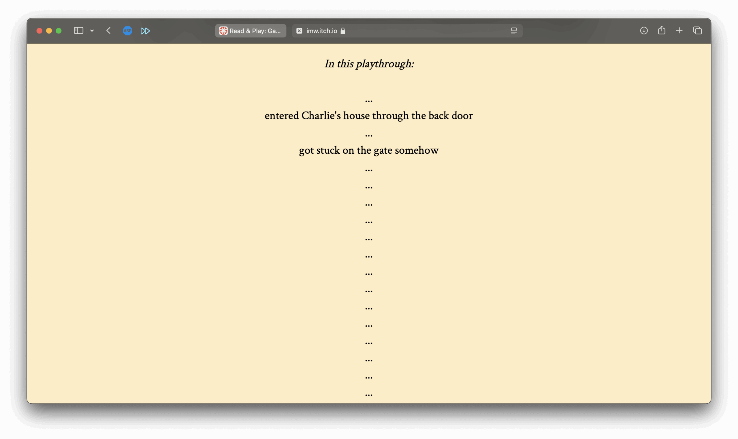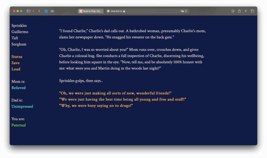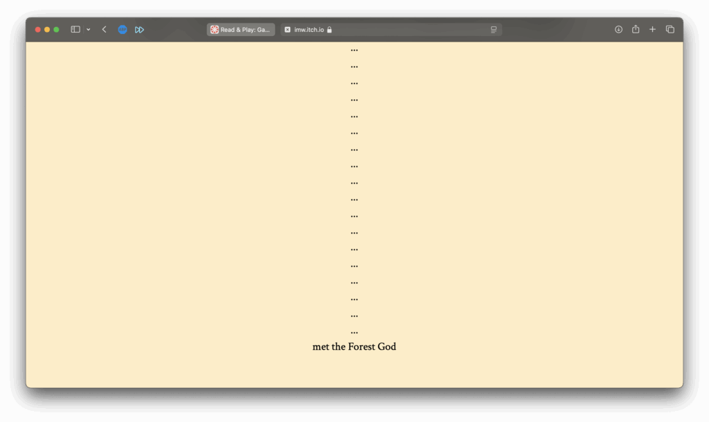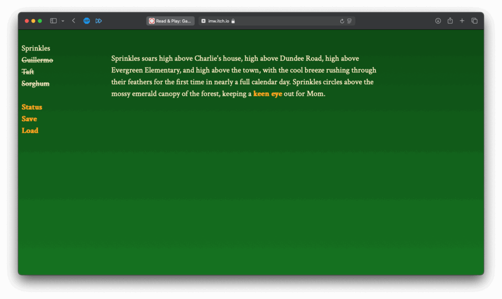 Animalia is interesting because I don’t think it necessarily fits nicely within any of the subgenres we’ve discussed in class (or, at least, the way I percieve them). It is purely text-based, like a parser, but takes no input and as such the only action the player can take is clicking on bolded words to make decisions and progress the story, similar to a visual novel, despite having no accompanying visuals. The only accompanying visuals are the colors that change in the background from time to time. These color changes are incredibly effective, as they occur infrequently and as such create and amplify tension in the story. The player finds themselves with a different-colored background for the first time in 20 minutes of play, coinciding with a tense event, which puts them even more at edge. This is especially effective during a chase scene I encountered during my story, in which the magpie Sprinkles chases down the mother of Charlie (the nine-year-old child) (Fig, 3). Considering what I am planning for my P2 as well as my lack of artistic abilities, it may be helpful for me to employ a similar technique for my game.