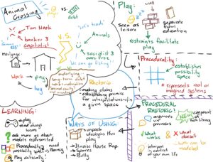It was interesting doing this week’s reading after playing this game because it made me reflect on the possibility space that the game created, even within such a restricted narrative. The choices you make as a player don’t have much (any?) impact on the outcome of the story, but the emotional reaction and your own interpretation of the takeaways of the game can vary greatly based on how you view the social systems described in the game through the lens of your own experiences. I think that this game was also very on-the-nose in terms of describing what social phenomena it was attempting to model, clearly showing how “play” here relates to a deeper understanding of the systems that make up mental health challenges (anxiety).