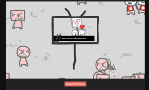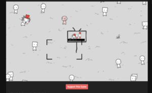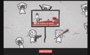 We Become What We Behold is a visual game also by Nicky Case! The game works by showing a bunch of stick figure characters wandering around an empty screen. There is a TV in the middle of the screen showing fake news broadcasts. Your mechanic as a player is a box that you can move around and click. Everything within the box is captured as a picture, and if something interesting is happening, it becomes a broadcast.