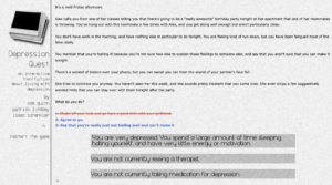Since I didn’t finish this game, I will talk about it in relation to Adventures with Anxiety! Depression Quest is a game by Zoe Quinn, Patrick Lindsey, and Isaac Schankler that attempts to show the player an accurate portrayal of experiencing depression. It has long narration with lots of details about your personal life and internal state.