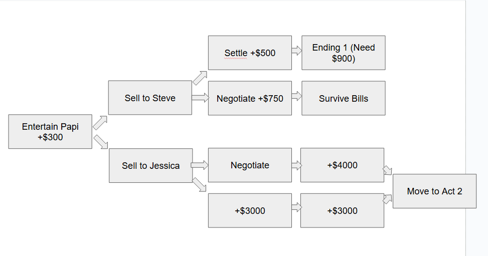 In act 1, your choices shape both the story and how much money you have by the end. Deciding whether to entertain Papi or argue with your dad changes your starting point—either getting some extra cash or starting off with tension and less support. From there, selling to Steve or Jessica becomes a key moment in terms of if you’re able to pay your bills the following night.