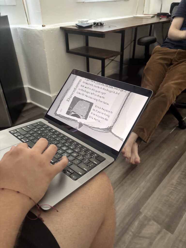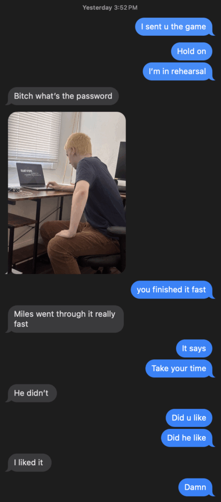 Amaru played my game in class, and I took a bunch of notes on what he said. Content-wise, he was pretty satisfied with what my writing and the storytelling had to offer—most of the qualms were due to the functionality of the parser system, something that I wasn’t really worried about as I knew I would be porting it over to Godot soon enough. Some highlights were, “What if I don’t pick up the phone?” Which led me to implement the phone ringing off the hook forever until it picked up—and an annoying sound so you couldn’t just ignore it. Amaru’s also a saxophone player, which is a pretty prime demographic for my game, so he laughed at a lot of my saxophone jokes. He also struggled to find the name of the jazz club and suggested clearer signposting and memory systems for critical information. That one moment made me ensure that the name of the club was emboldened and in a different color for the final game.