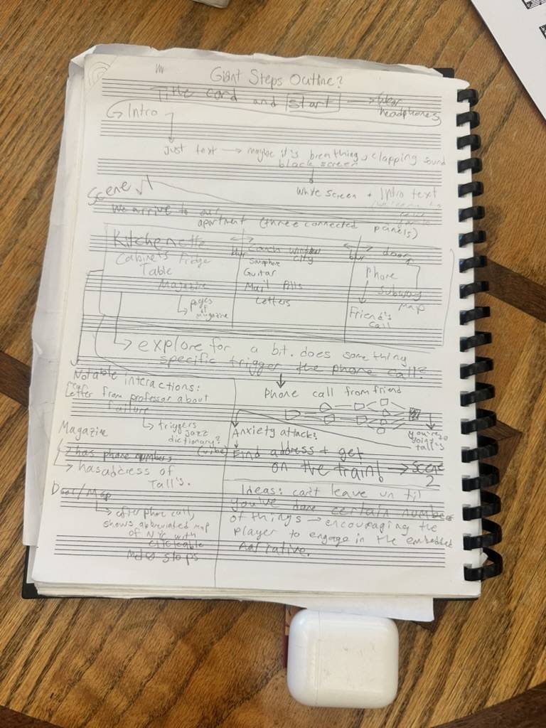 I created this game from a place of personal experience. Recently, I was invited to a traditional jazz jam session. This was the kind of thing that used to be my favorite activity since I was twelve or thirteen. I felt excitement at the idea of coming back to something I hadn’t done in years. What I didn’t expect was the physical reaction: driving there, I was overwhelmed with nausea and anxiety I hadn’t felt in a long time. That disconnect between what I wanted to do and what my body would allow became the emotional core of Giant Steps.