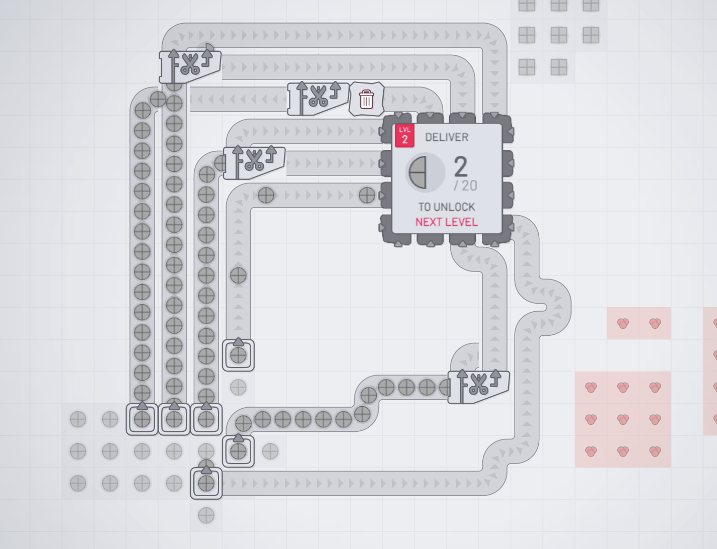 In terms of genre, the game seems like a mix of factory simulation and sandbox game. There’s no narrative or “win” state, but there’s a sense of progress that comes from achieving greater efficiency. For example, with every level there is a counter that tracks how close you are to the goal (such as 20 pieces out of 50) and the speed at which it ticks up essentially helps you understand how efficient your factory is.