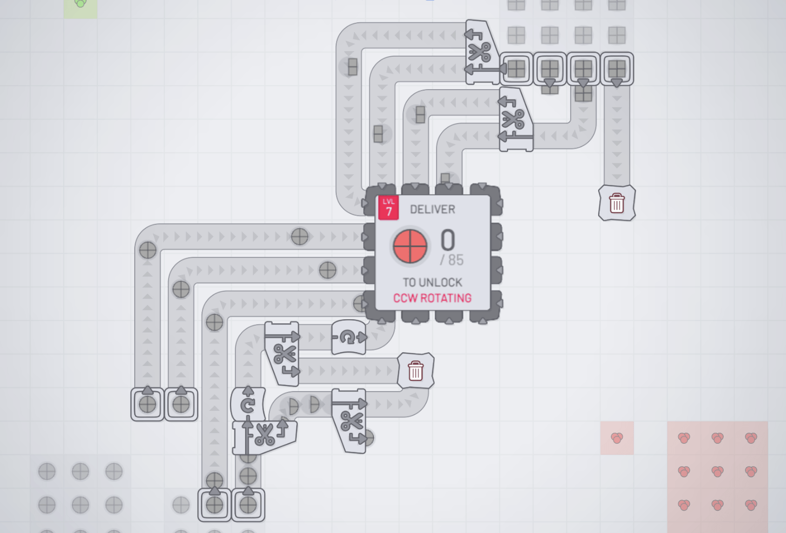 I also experienced a clear skill chain since each new mechanic built directly on what I had already learned. For example, I first used simple extractors and connecting conveyors to move shapes. Once I met that goal, the game layered in tools like cutters and rotators that required me to combine those earlier skills in new ways. Eventually, I was managing complex systems with trash and painting, where each of these new machines depended on my understanding of flow and efficiency from earlier stages.