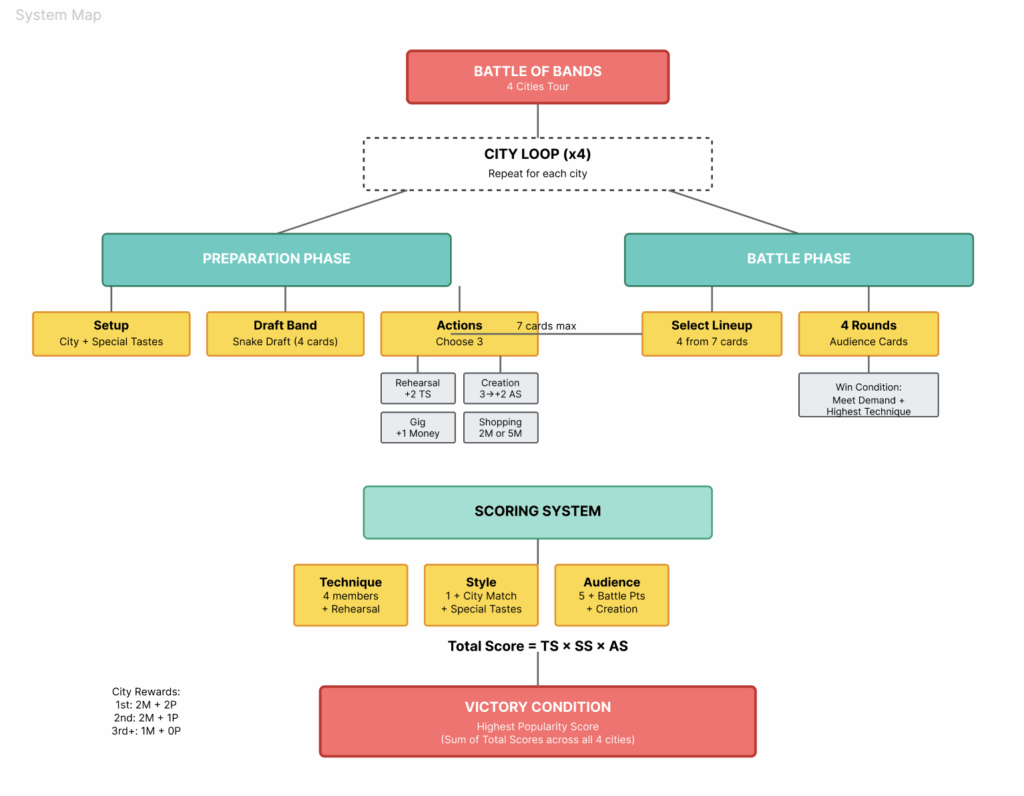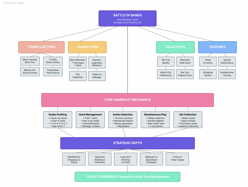 The two concept maps show different ways of viewing the same game system. The first one, the System Concept Map, captures Battle of Bands as a process. It organizes the game through time, following the loop that repeats across cities, from the Preparation Phase to the Battle Phase to Scoring. It answers the question “how does the game work?” by showing the order of player actions and how the system changes at each step. The second map, the Game Concept Map, captures the game as an idea rather than a process. It groups elements into core design pillars like theme, characters, objectives, features, and mechanics. It answers “what is the game made of?” by breaking down the structure and components that define its identity.