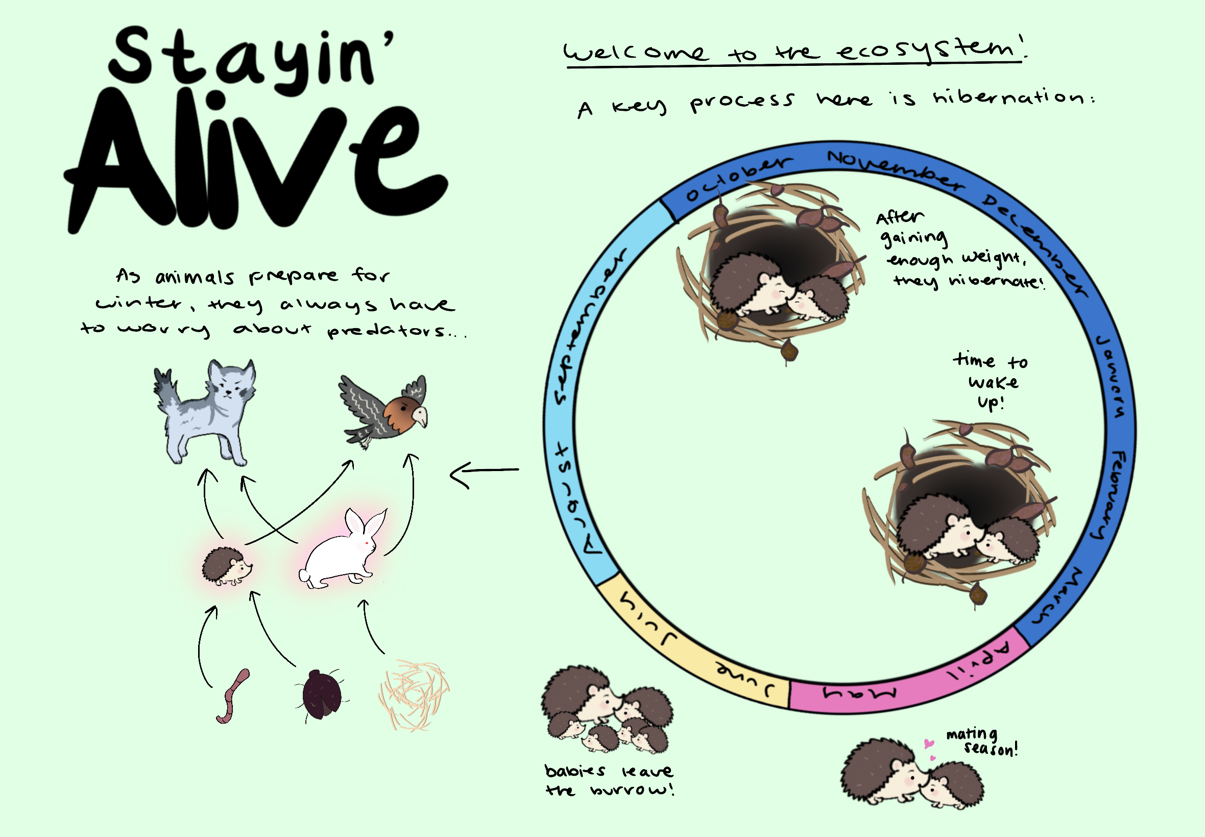 In both of our concept maps, we focus on the same idea of an ecosystem where animals are constantly trying to gather enough resources while staying safe from predators. The ecosystem map shows this at a broad, biological level by laying out the full yearly cycle of a hedgehog. It includes mating season in the spring, babies leaving the burrow in the summer, the fall feeding period, and finally hibernation in winter. Predators like foxes and hawks show up throughout the cycle, which helps us highlight that danger is always present in the system.