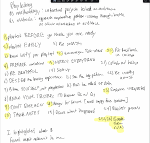 My sketchnote is a list of the ‘rules’ of playtesting, and I highlighted what I think were most important.