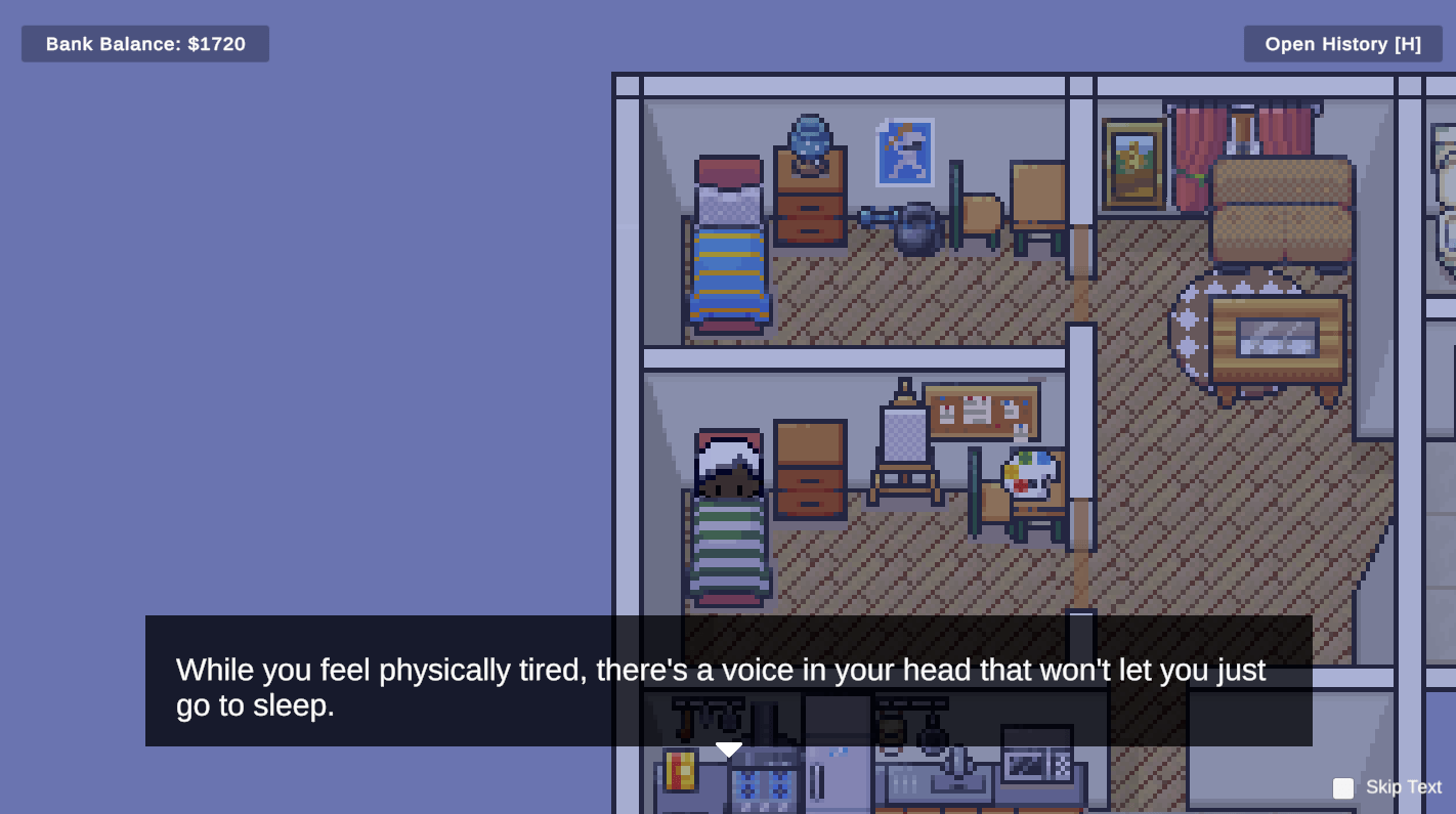 A major focus of iteration was aligning player actions with the narrative themes of artistic compromise, financial precarity, and value-driven decision-making. Earlier versions of the game allowed players to reach bad endings through outcomes that felt disconnected from their artistic philosophy, such as being financially punished without sufficient narrative foreshadowing. By adding an early reflective scene about upcoming bills and restructuring how income and expenses are distributed, player failure now feels more clearly tied to their values and choices rather than arbitrary systems. Similarly, adjustments to AI-related bedtime thoughts were designed to narratively motivate temptation toward automation, ensuring that turning to AI feels like a meaningful thematic decision rather than a purely mechanical shortcut.
