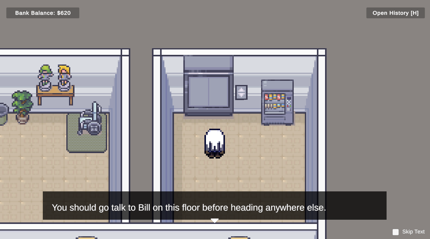 An additional thing that I fixed was a major bug within my game in P2 where you could skip Bill/Charlotte’s story if you went up the elevator instead of talking to him. You could also repeatedly go up and elevator and get unlimited money by quitting your job over and over. Now, this is fixed!