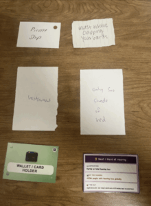 This session also marked the first time we tested the game using the finalized graphic design for all card types. In the last playtest, participants had noted the need for more consistent and complementary visual elements across categories. In response, we implemented a new system for the cards. Rather than having the user and design principle cards share similar color themes, we decided to implement a clear green-blue-purple color scheme across the three types of cards, which creates a meaningful connection to accessibility and inclusive design on multiple levels. From a practical standpoint, green and purple/blue are highly distinguishable to people with the most common forms of color blindness (red-green color blindness), ensuring the three card categories remain visually distinct for all players while providing strong contrast against the cream background for those with low vision. Symbolically, each color carries significance: green represents “go” and “accessible” in universal design language while grounding the physical object; blue is universally used in accessibility signage and conveys the trust and empathy central to human-centered design; and purple bridges creativity and cognitive thinking, representing the innovative principles that transform ordinary objects into accessible solutions. Together, this triad reinforces the game’s core philosophy– green for what you’re making (the object), blue for who you’re making it for (the user), and purple for how you’re thinking about it (the design principle) – creating a color-coded mental model that embodies the heart of accessible design thinking. Additionally, all cards contain information in the sans serif font, Arial, as it is widely considered to be a solid, accessible, and professional default font that’s commonly used in communities with accessibility needs.