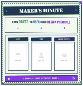 By the end of gameplay, players will walk away as more creative and equitable designers and communicators. They will have practiced applying core design principles to accessibility-focused problems and honed their ability to generate ideas under constraints. Additionally, the process nurtures flexible, empathetic thinking– essential qualities for innovation in any design context.