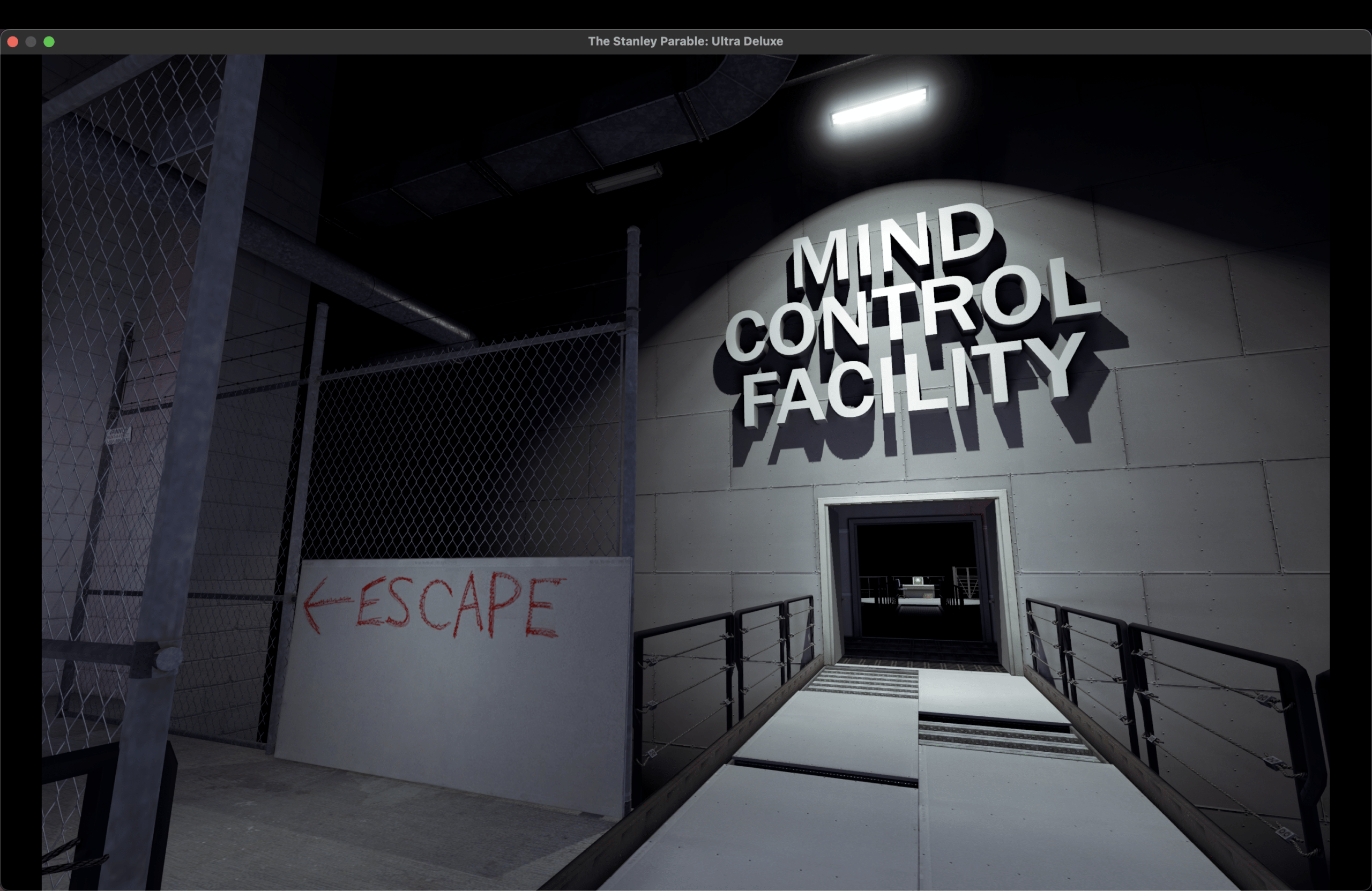 I chose to go down the ESCAPE hallway rather than the Mind Control Facility because that sounds bad! Immediately, the narrator begins saying ‘If you keep going down, Stanley will die horribly,’ and continues to reiterate this message the further you go, even highlighting the fact that the door is still open and you can return at any time. After committing to this route, the narrator will criticize the player for trying to act in a world that they do not fully understand, killing Stanley and restarting the game. By giving the players freedom to explore outside the straightforward route, The Stanley Parable can embed narratives targeted to specific groups of players in response to their inherent assumptions coming into the game. For casual gamers, they can easily reach the ‘good’ ending and are encouraged to replay for new information, but veteran gamers will be criticized and made fun of for first searching for ‘alternative endings.’ Such unique narratives for each player results in more impactful narrative messaging and ultimately encourages all players to continue playing to uncover new parables on approaching video games.