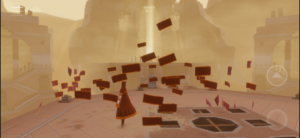 The desert and ruins both tell the story through movement. In the early screenshots, the player is a tiny robed figure surrounded by huge dunes and warm golden light, making them feel more like a small traveler than a powerful hero. Walking through sand feels slow, while sliding down dunes feels graceful and freeing, so the player feels the mood change through the way they move. Later, the ruins add history to that feeling. Broken bridges, tiled platforms, glowing cloth fragments, and massive abandoned buildings suggest that a civilization once existed there, but the game does not explain everything through dialogue. Instead, it asks the player to walk through the evidence. The broken architecture is not just decoration, but it changes where the player looks, how they move, and what they imagine.