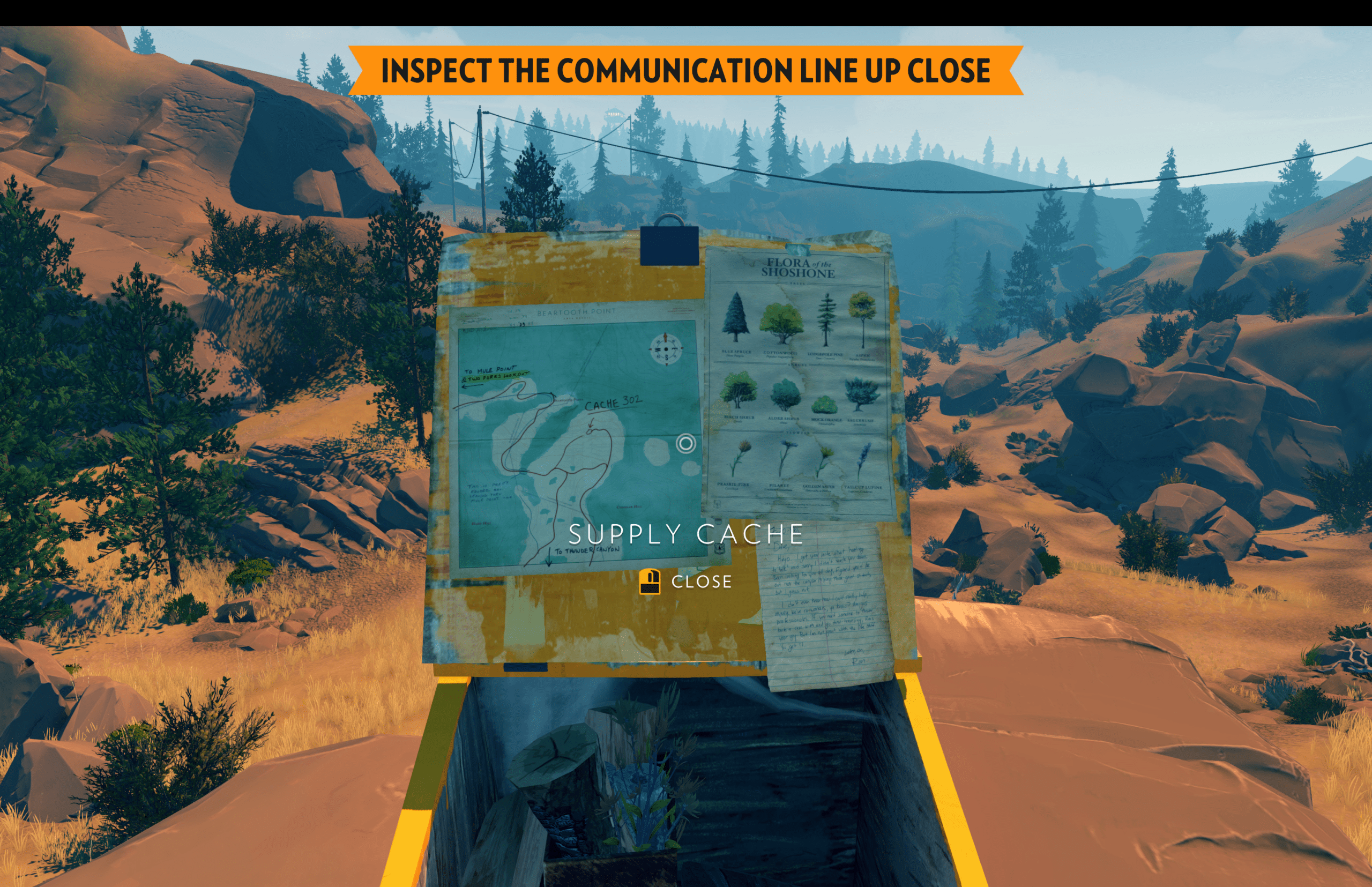 Firewatch uses an embedded narrative through interactable objects that tell the overall story and backstory of the game. The forest and lookout tower are dense with things you can pick up, examine, and sometimes keep. For example, picking up a whisky bottle on day 1 appears on the main character Henry’s desk the next morning. This was a detail that really excited me and made me look for other things to pick up. Locked supply caches contain letters between previous rangers that hint at previous lives and characters. Most of the small interactables, like a photo of Henry and his wife, do not advance the main story, but instead advance your understanding of the space and the people who have moved through it. This is the game’s primary method of environmental storytelling since the environment holds the narrative without necessarily spelling it out. Because items are not mandatory to pick up and talk with Delilah (another lookout and Henry’s boss), players will have different levels of understanding depending on how much they want to interact with the things around them.