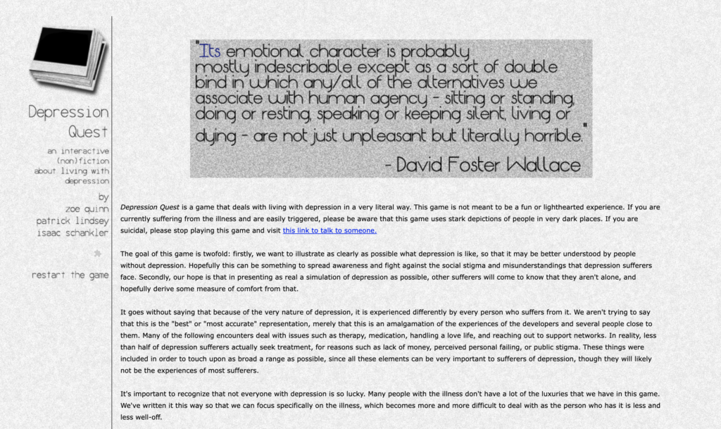About this Game Depression Quest is an interactive fiction game where players experience the daily challenges of living with depression, making choices that reflect…